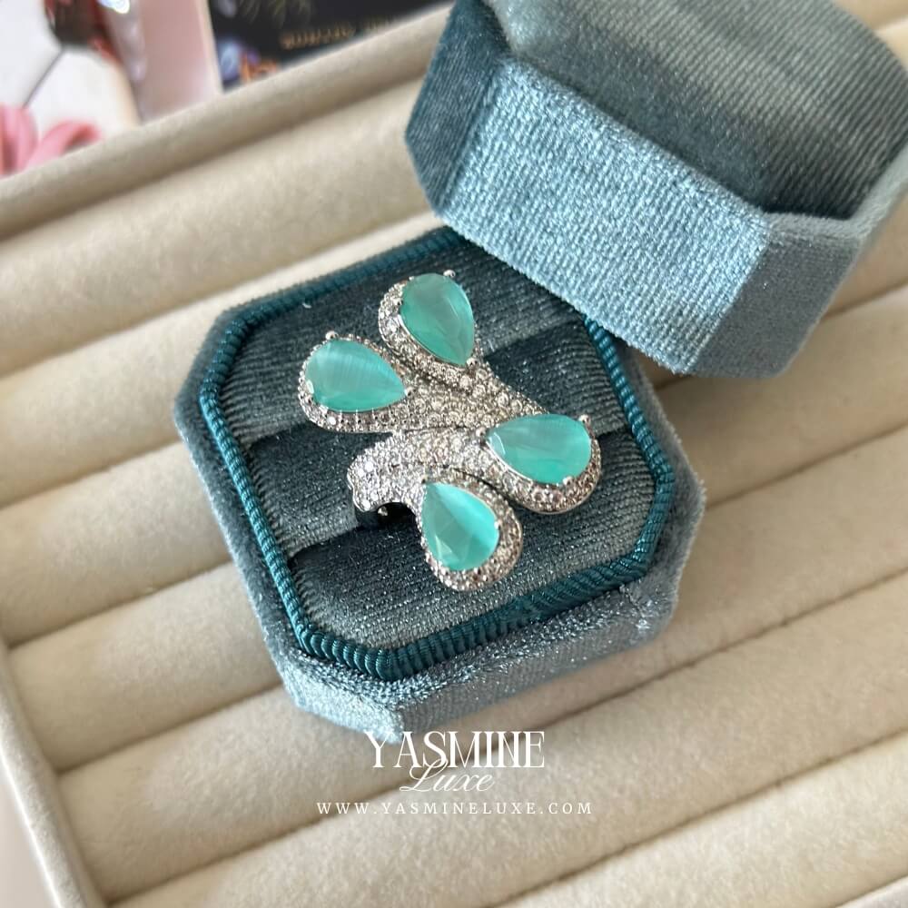 Silver Toned Butterfly Design Ring with Aqua Teardrop Stones & Clear Zircons