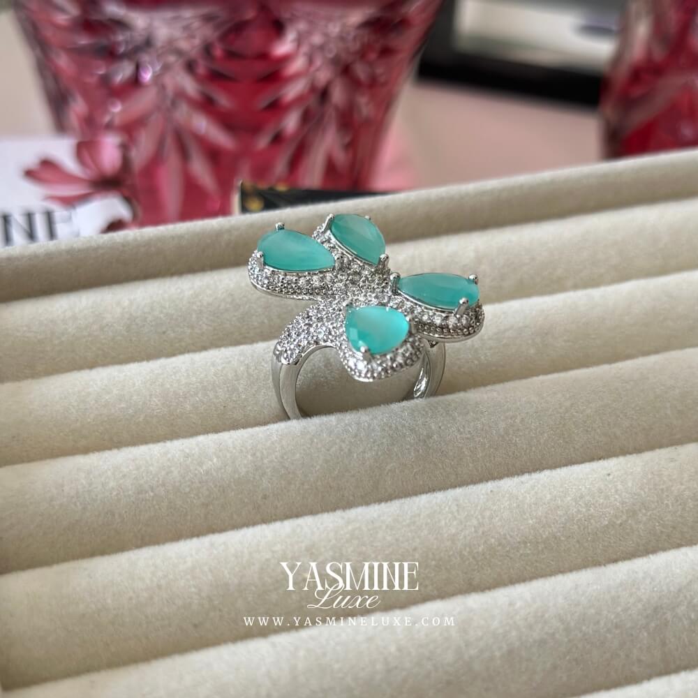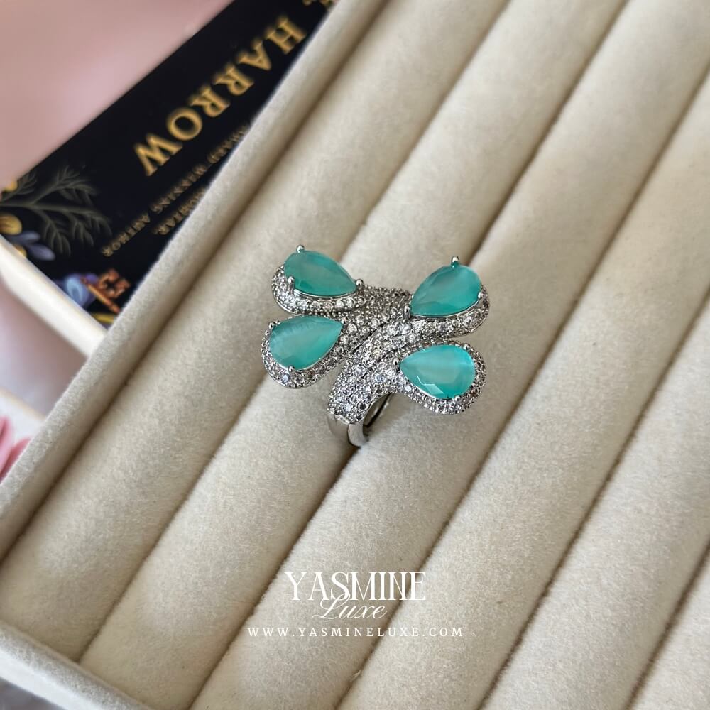 This elegant ring features a polished silver-toned finish with a charming butterfly or four-leaf clover-inspired design. The central motif is adorned with four striking aqua or light blue teardrop-shaped simulated stones, symmetrically arranged and bordered by dazzling clear zircons.