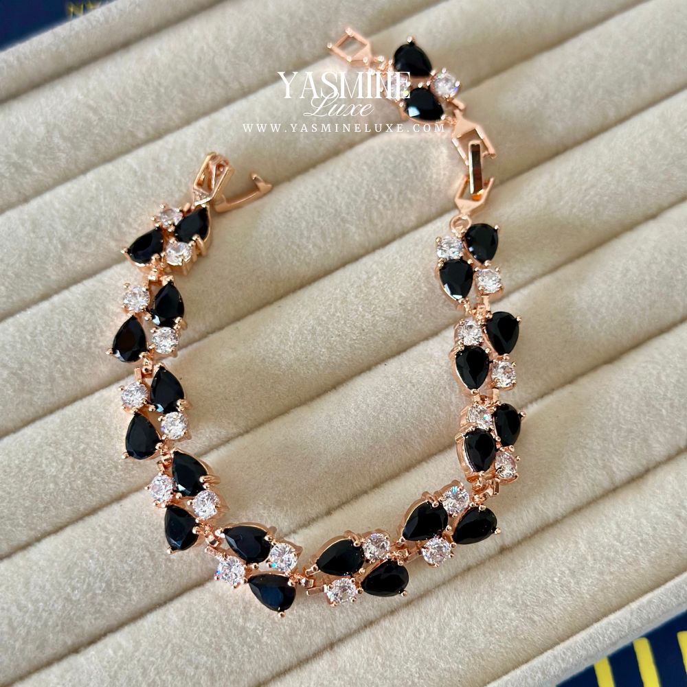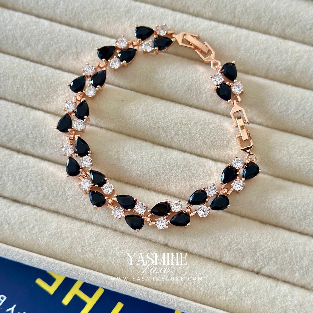 Rose Gold Toned Black Teardrop & Clear Zircon Leaf Design Bracelet
