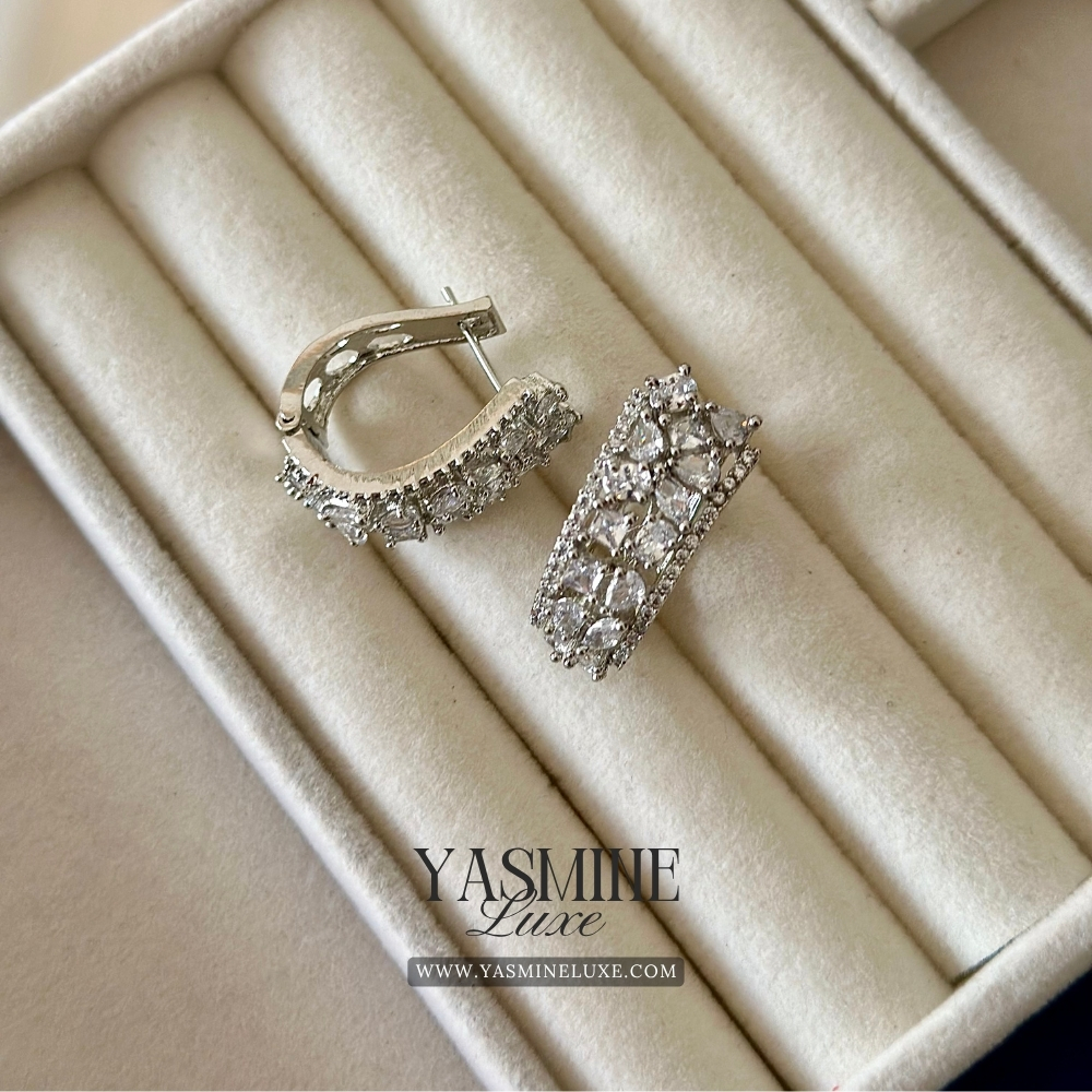 These beautiful silver-toned hoops are adorned with a radiant mix of marquise and round cut zircons, creating a lovely, shimmering effect. They’re designed to add a graceful sparkle to your look, whether you’re dressing up or simply want to feel a little more special.
