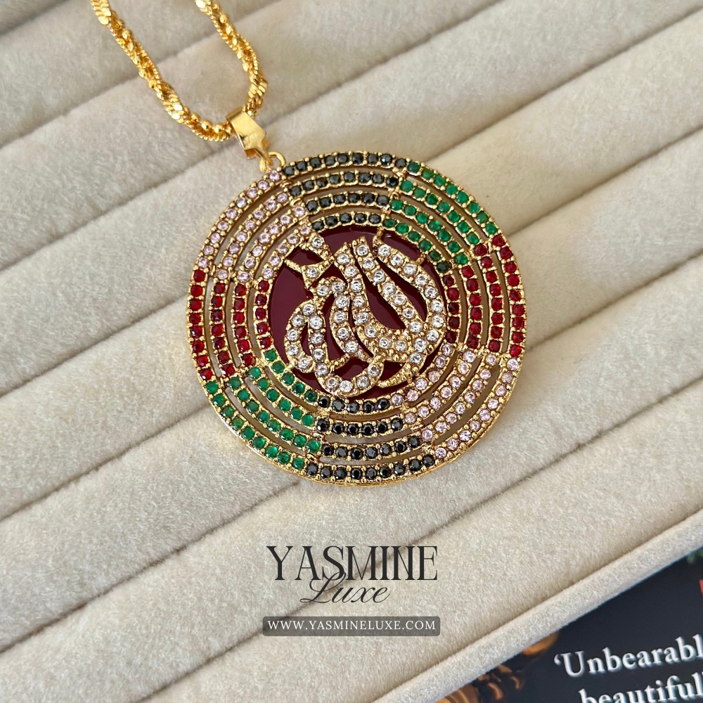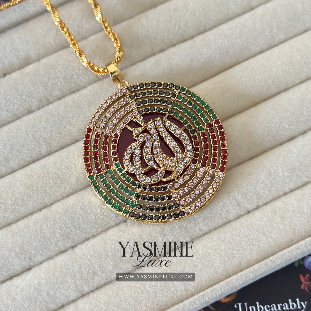 Gold Toned Multi-Color Zircon ‘Allah’ Calligraphy Pendant Necklace