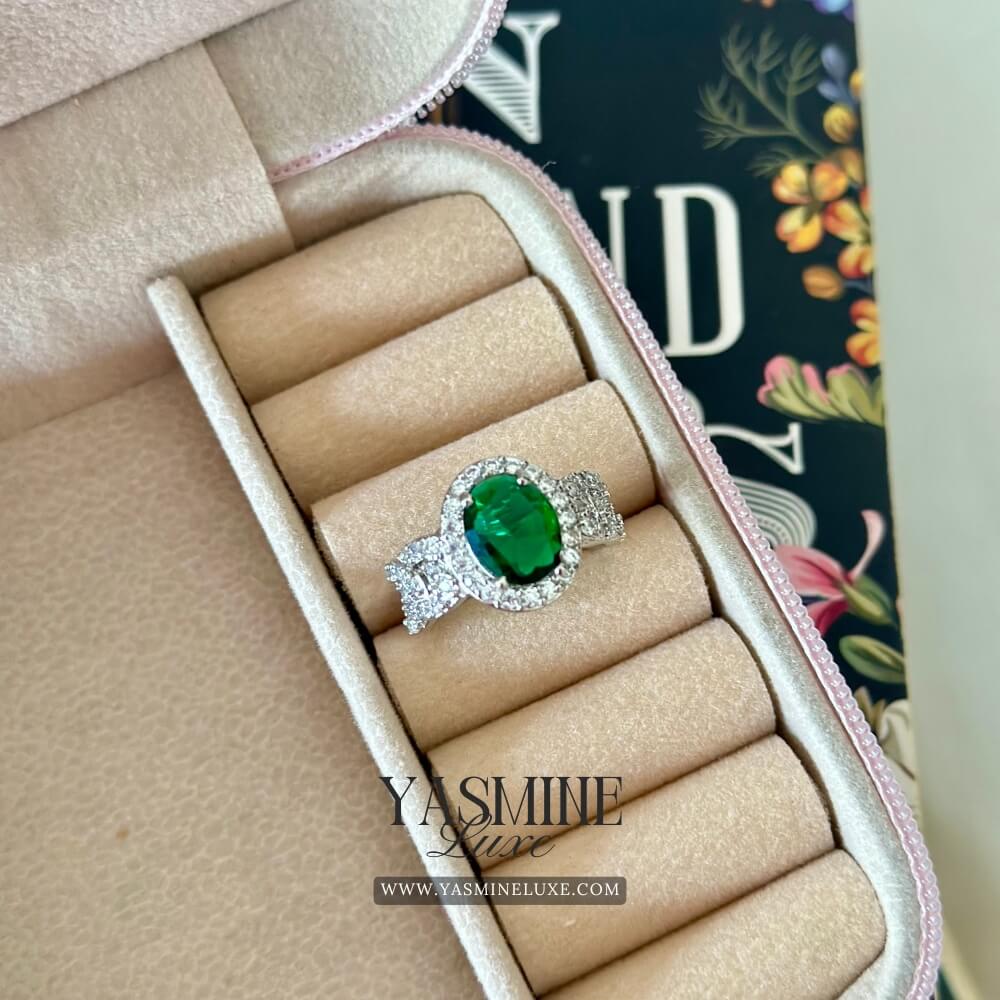 Tags: adjustable ring, designer jewelry, elegant ring, green stone ring, silver ring, sparkling ring, statement ring, zircon embellishments