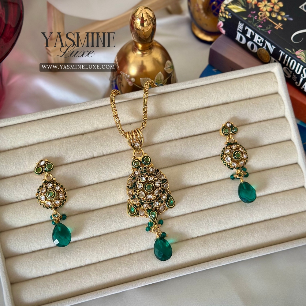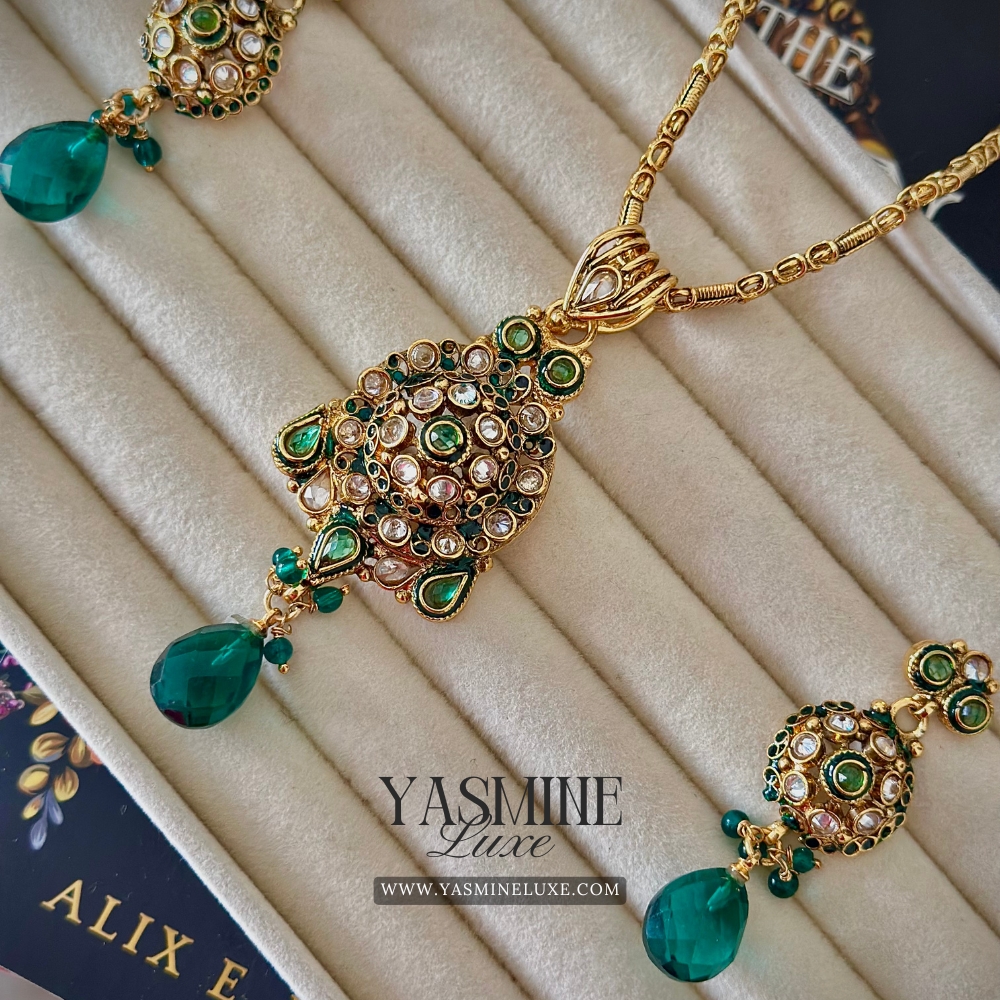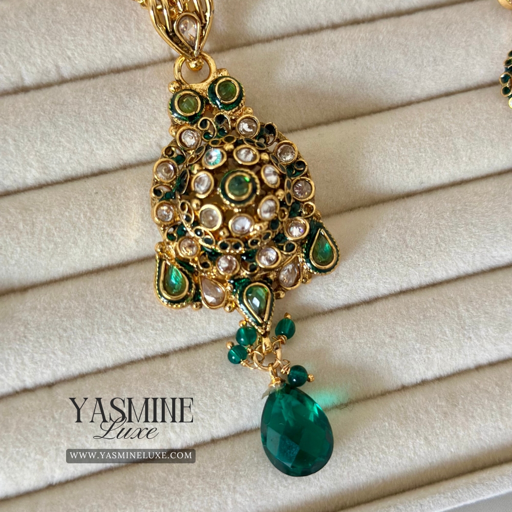 Each drop earring mirrors the pendant’s Kundan-inspired aesthetics, featuring a round/oval top section with detailed gold-toned work, embellished with clear zircons and small green stones, from which hangs a matching faceted emerald green teardrop/pear-shaped gemstone.