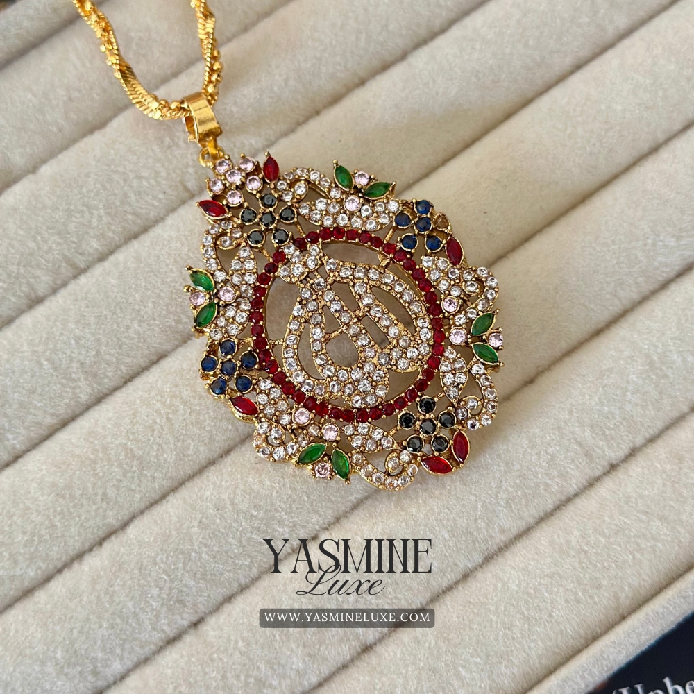 Gold Toned Multi-Color Zircon Floral ‘Allah’ Calligraphy Pendant Necklace