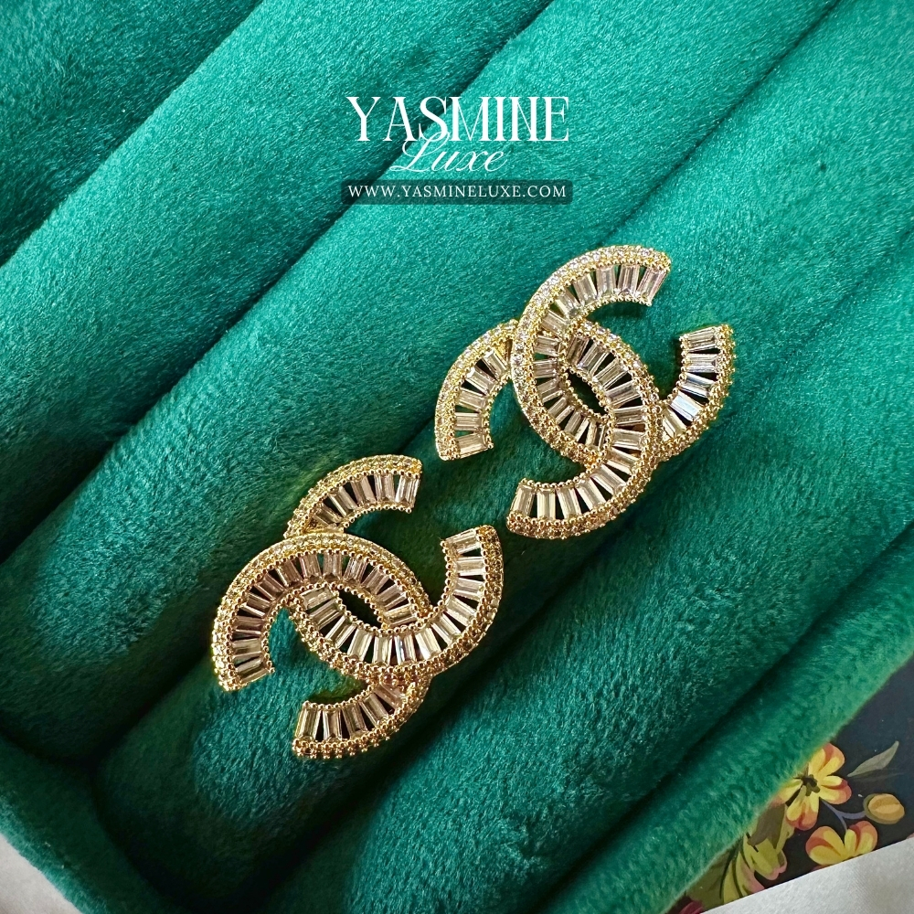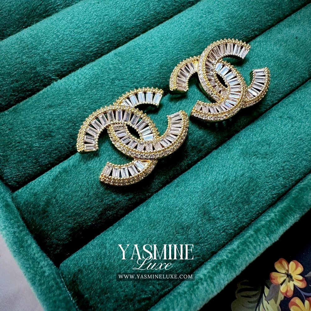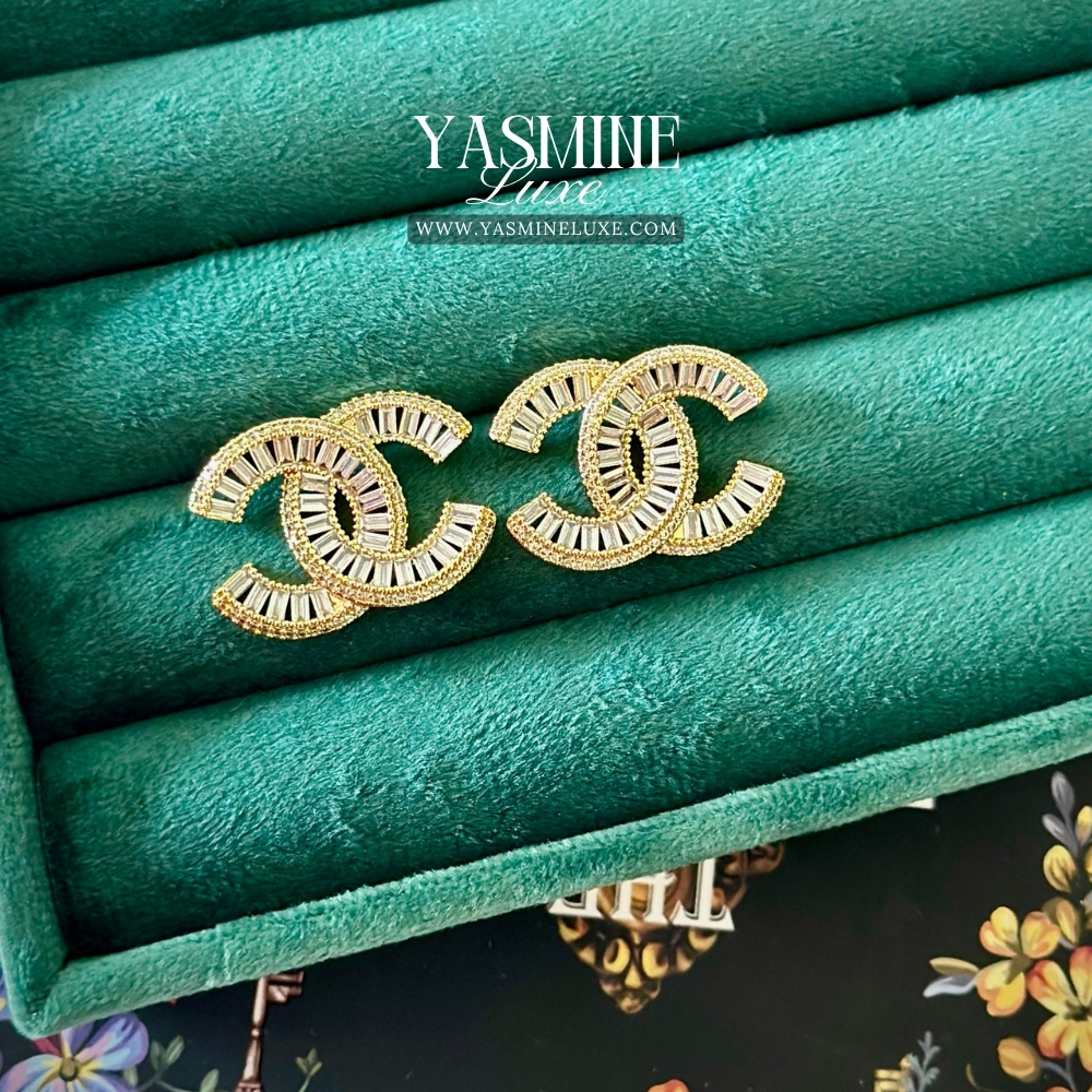 Tags: baguette zircon, chic jewelry, contemporary earrings, designer-style earrings, elegant studs, gold studs, interlocking C design, sparkle studs