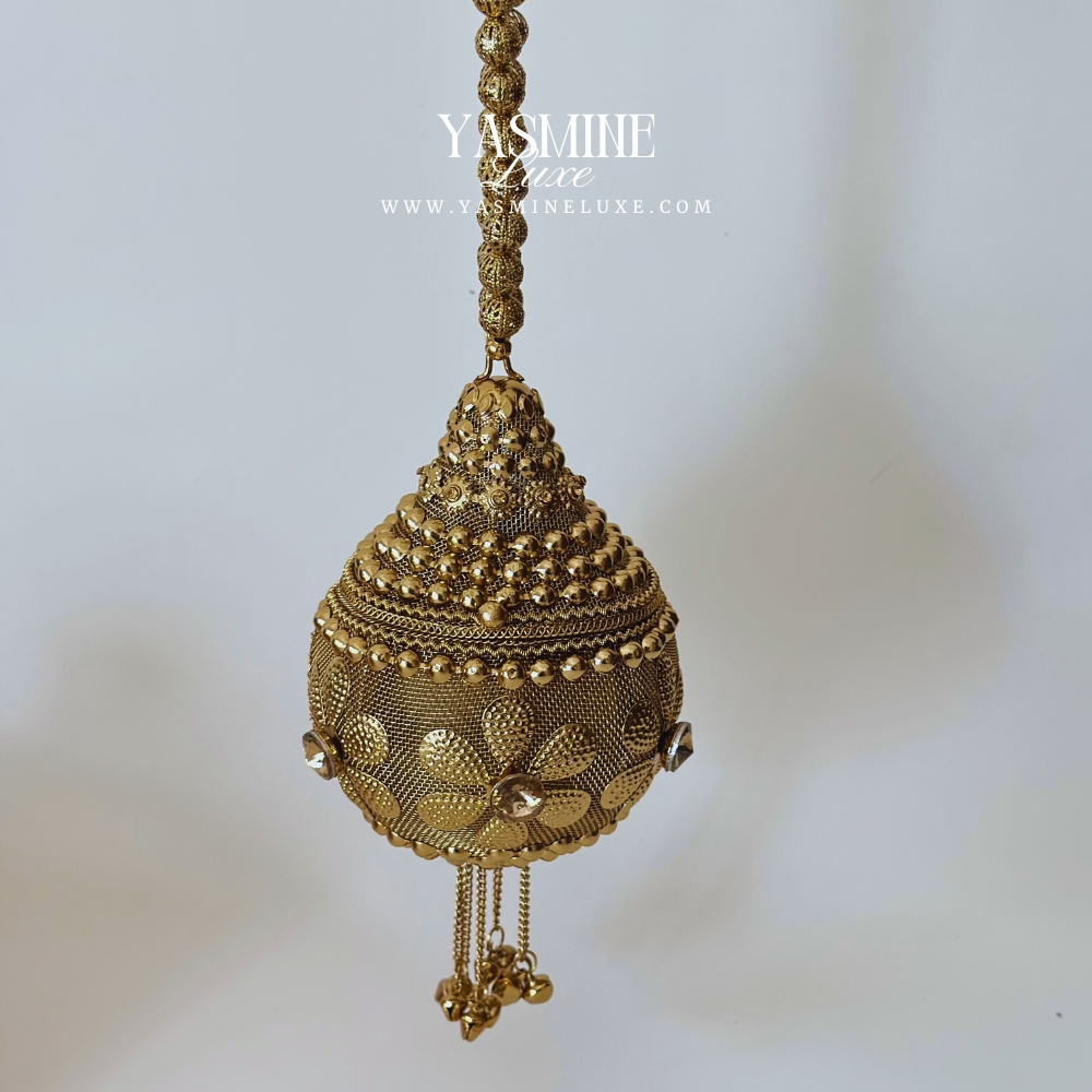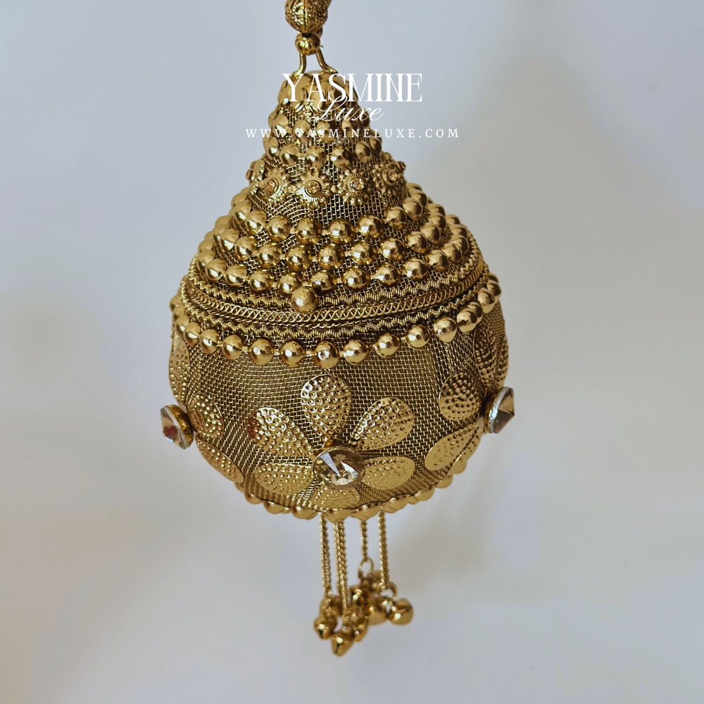 Design: A traditional Indian/Pakistani hard-case potli bag, characterized by its distinctive bell-shaped or conical body.