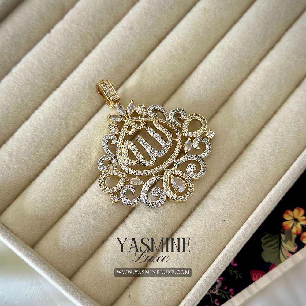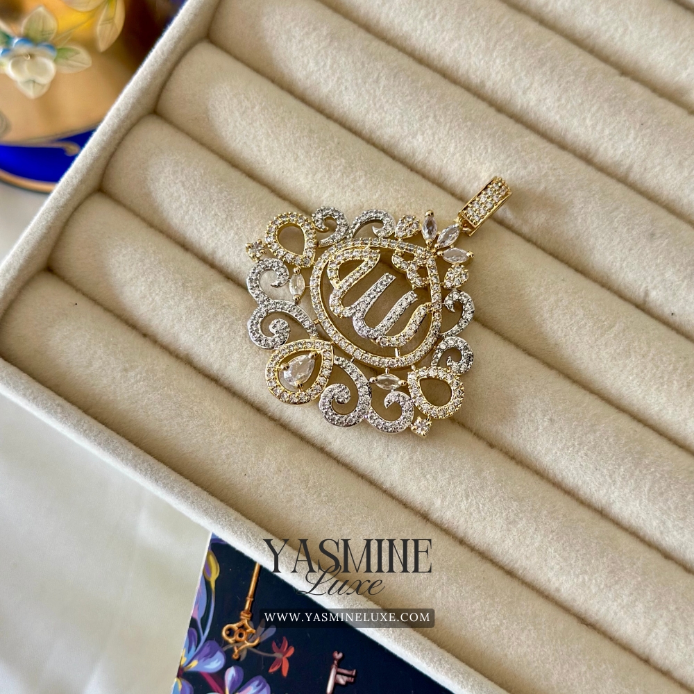 Elegant Dual-Tone Zircon “Allah” Calligraphy Pendant with Swirl Design. (WITH CHAIN)