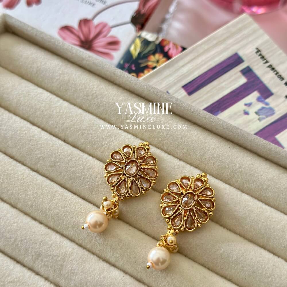 These elegant earrings feature a stylized floral stud with a detailed setting of warm-toned stones that resemble marigold petals. A single, delicate pearl hangs from the bottom, creating a refined and sophisticated look that is versatile for many occasions.