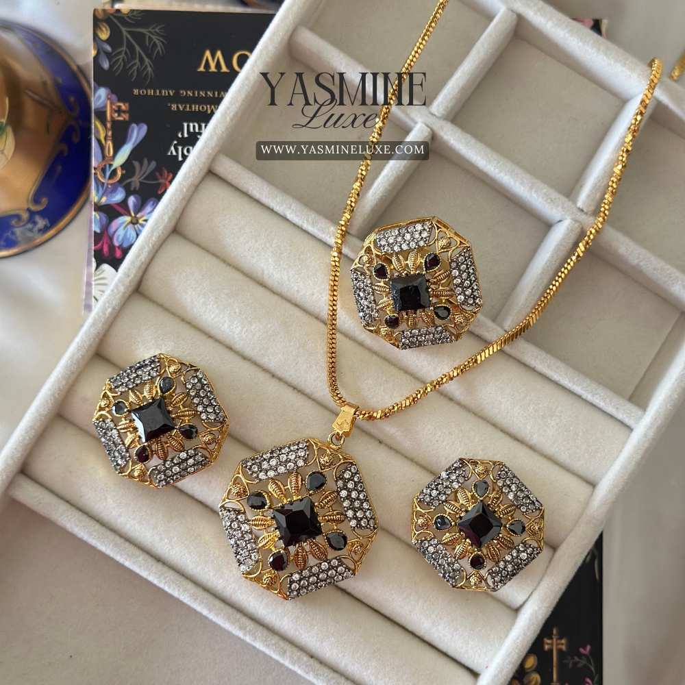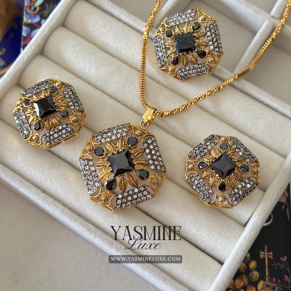 A stunning fusion of deep black stones and intricate gold detailing, exuding timeless elegance and regal charm. Perfect for any special occasion!