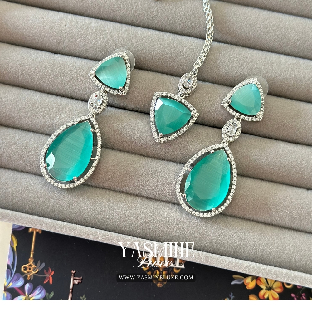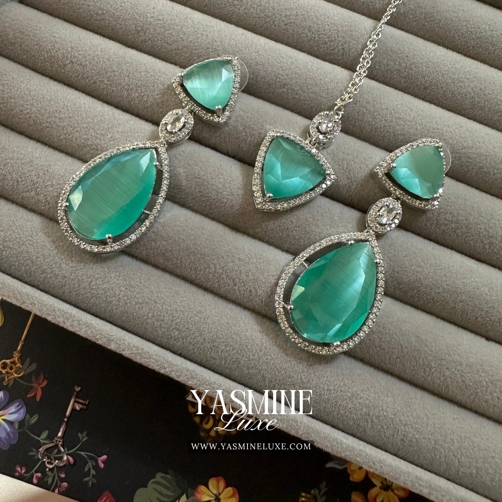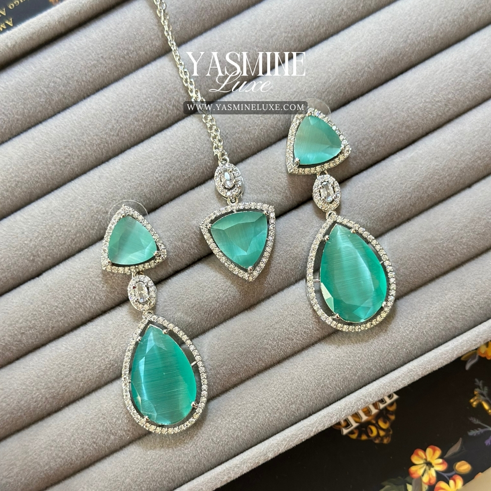Elegant Silver Toned Mint Green Cats Eye & Zircon Dangle Set