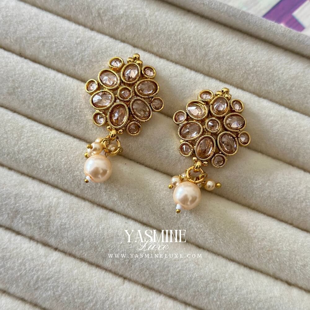 These elegant gold-toned earrings feature a large, ornate stud decorated with multiple light brown stones. A single, delicate pearl hangs from the bottom, creating a simple and sophisticated look that is versatile for many occasions.