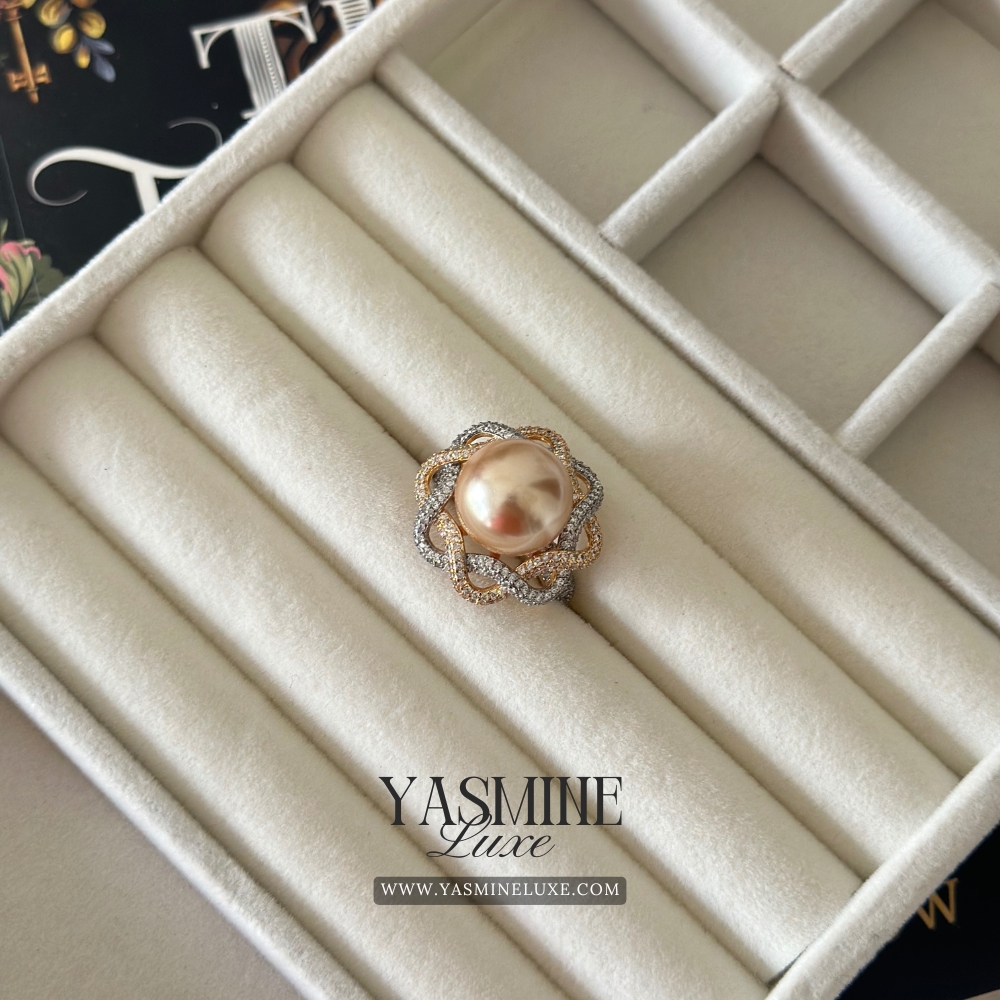Luxurious Tri-Tone Zircon Pave & Peach Pearl Bloom Ring (Adjustable)