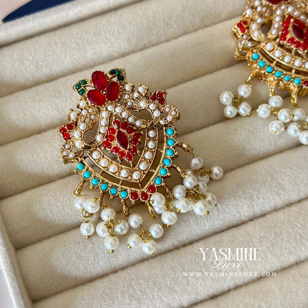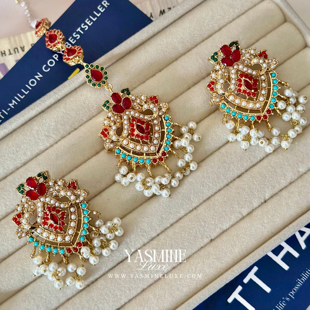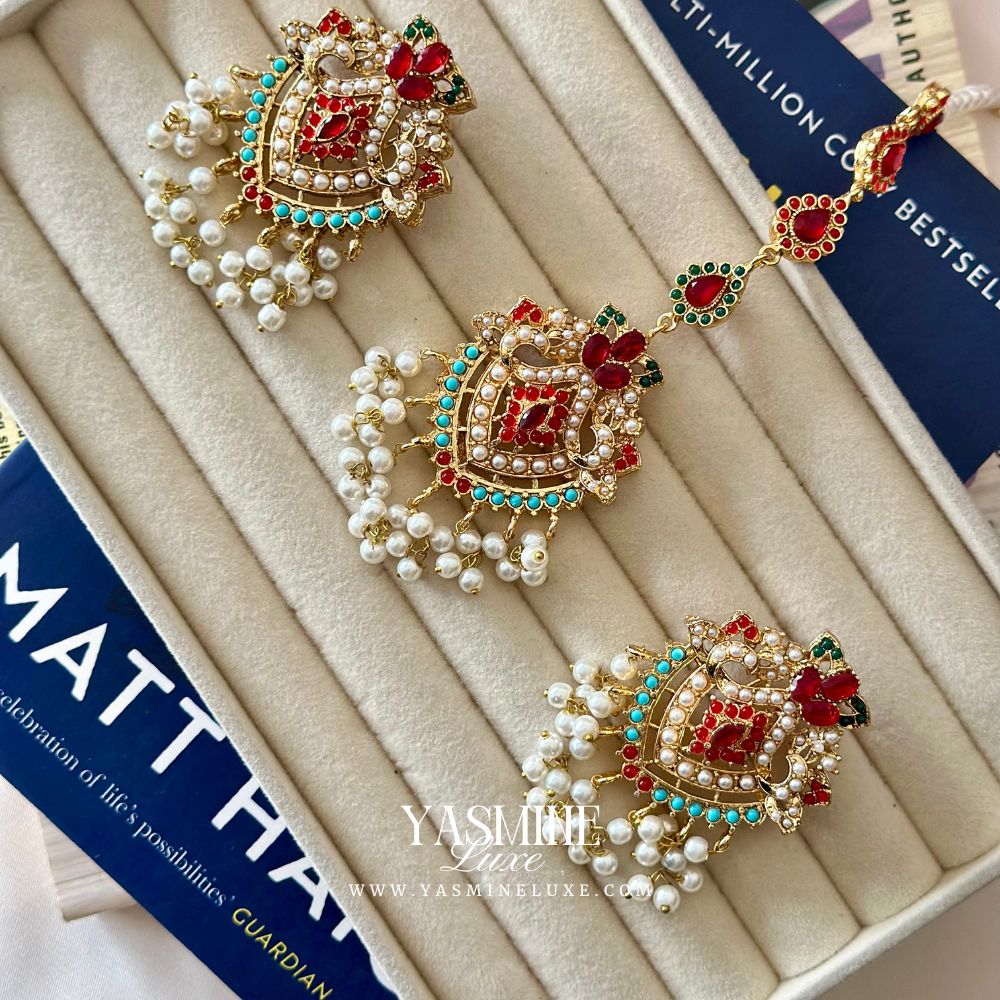 This grand and ornate set includes a pair of earrings and a matching maang tikka. The design features a unique, shield-like shape with a prominent red stone in the center. The pieces are richly detailed with an assortment of red, green, and turquoise stones, and finished with a delicate border of white pearls, creating a vibrant and festive look.