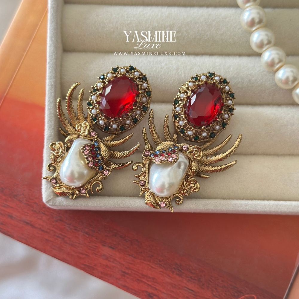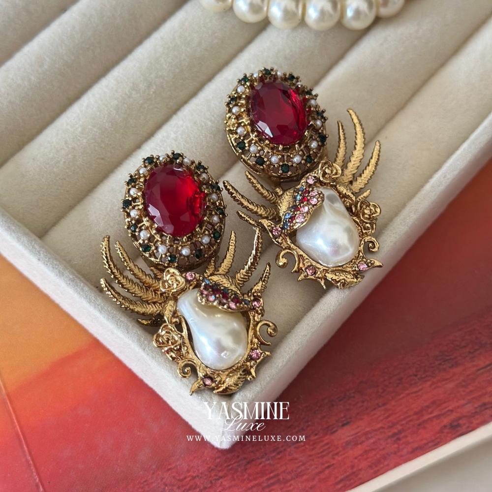 Gold Toned Ruby Stone & Baroque Pearl Drop Earrings with Multi-color Accents