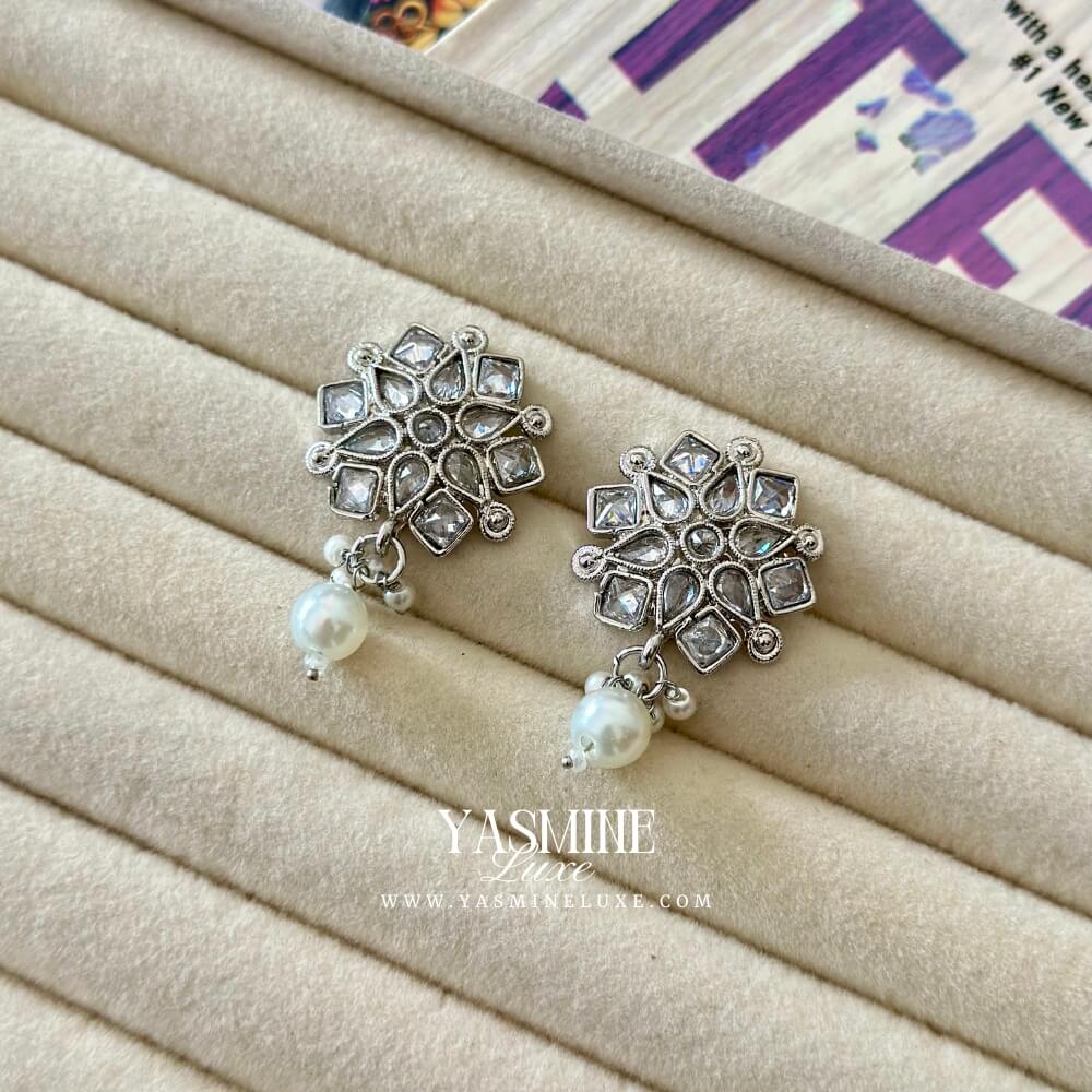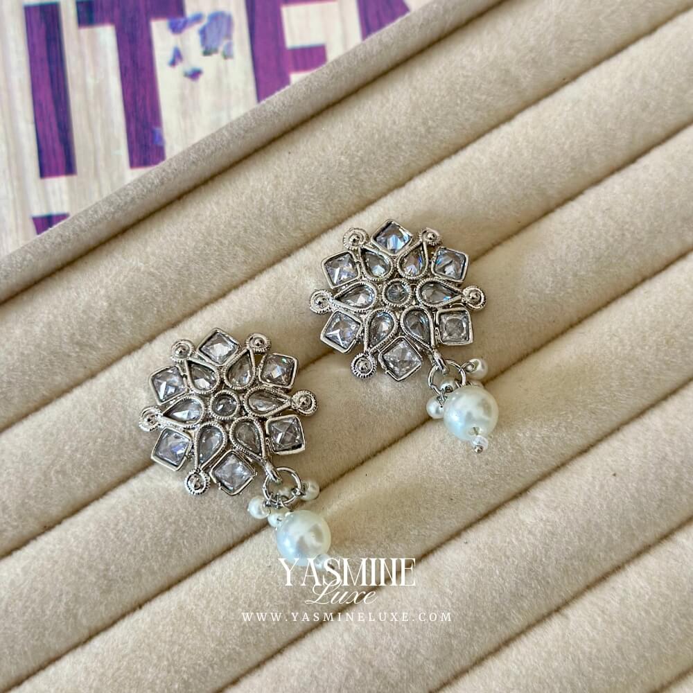 These elegant, silver-toned earrings feature a large stud with a unique cluster of square-cut stones, reminiscent of a star. A single, delicate pearl hangs from the bottom, creating a classic and sophisticated look that is perfect for any occasion.
