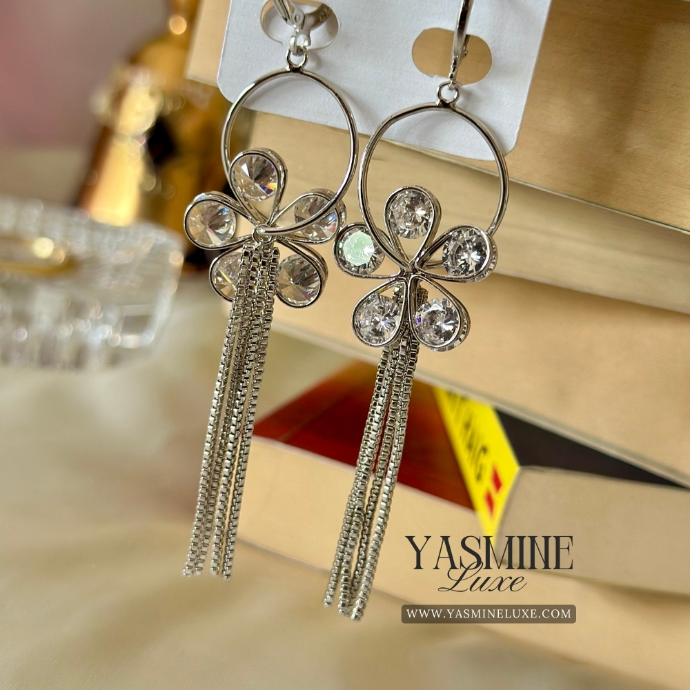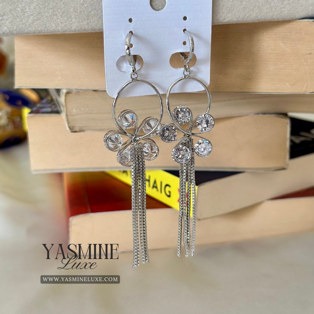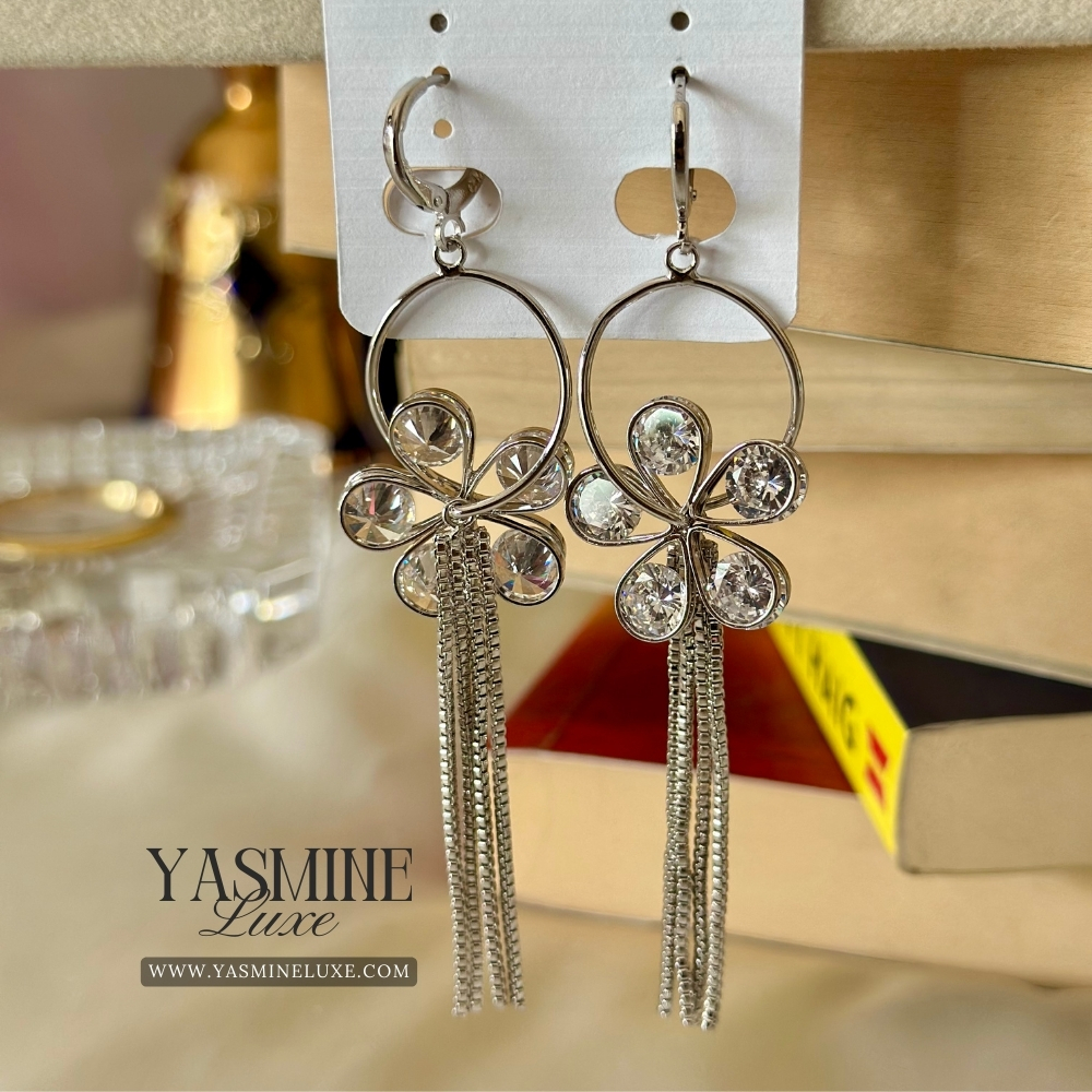 These elegant drop earrings feature a captivating flower-shaped cluster of brilliant clear zircons, suspended from a sleek silver-toned hoop. Below the sparkling blossom, multiple delicate chains cascade gracefully, creating beautiful movement and a dazzling shimmer with every turn.