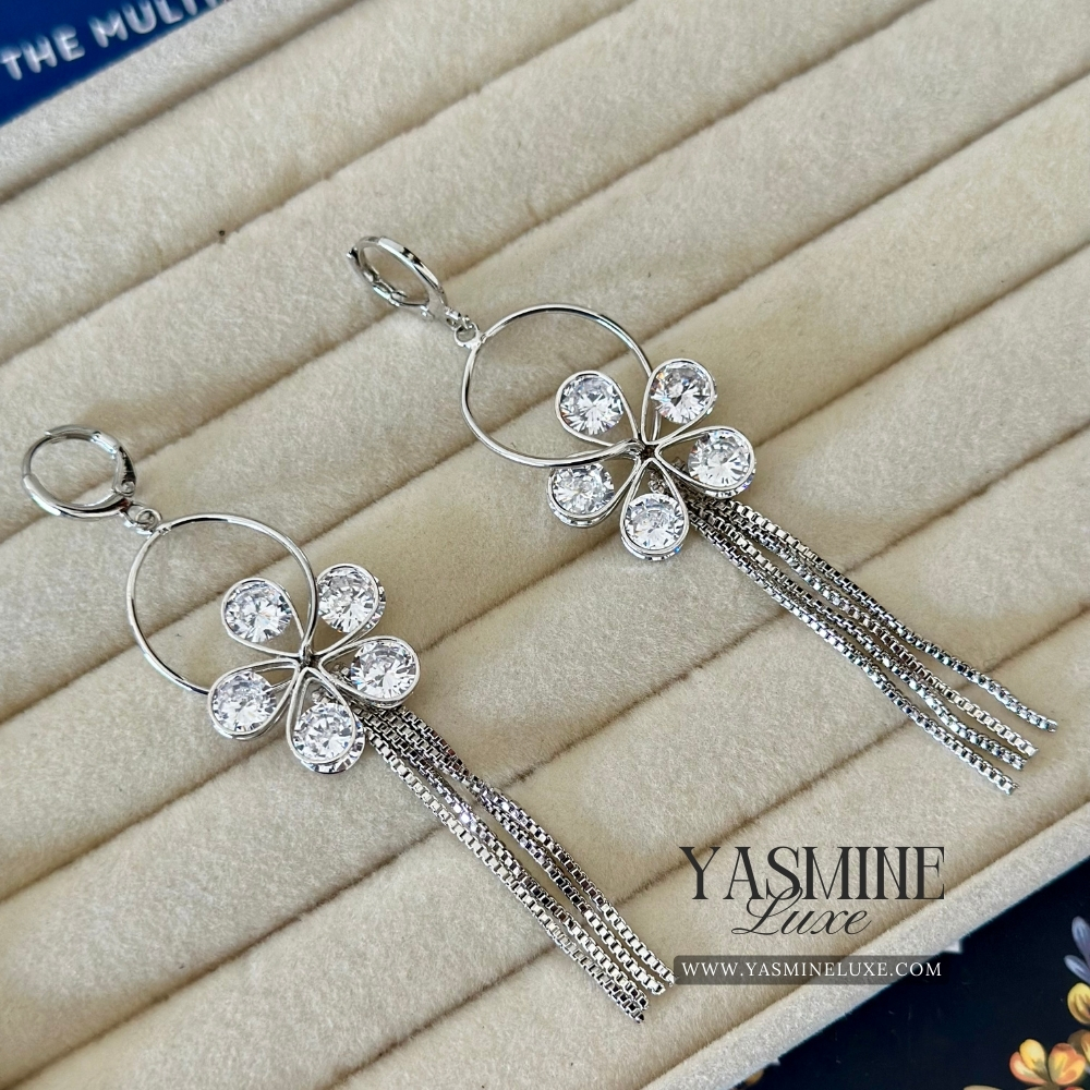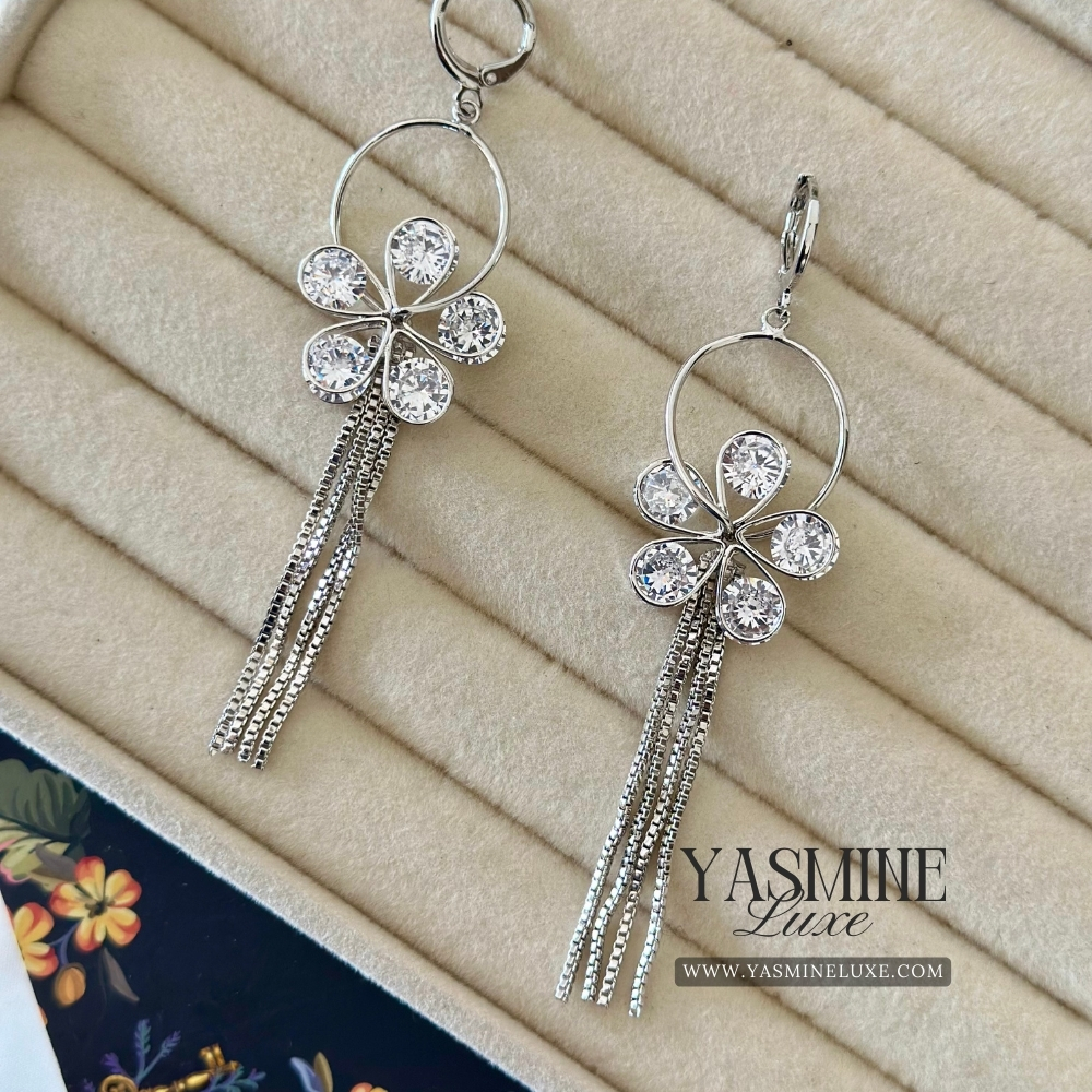 Elegant Silver Toned Zircon Floral & Chain Drop Earrings