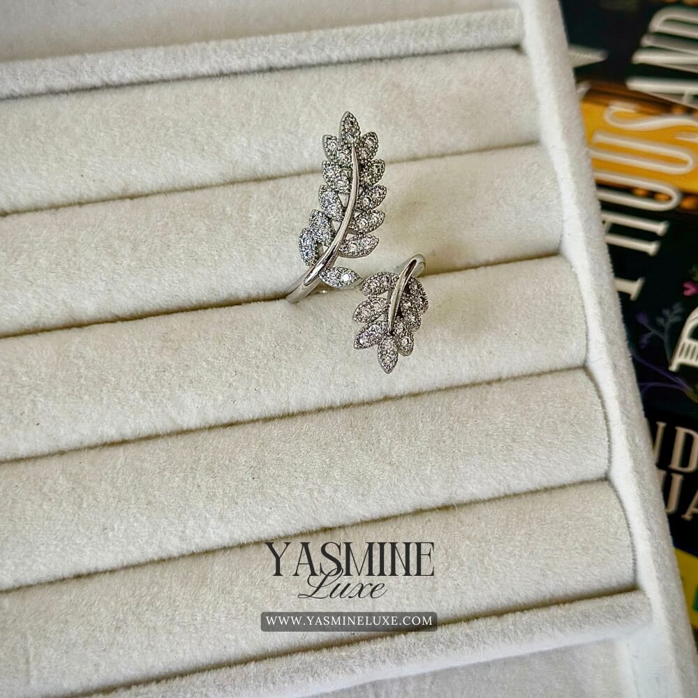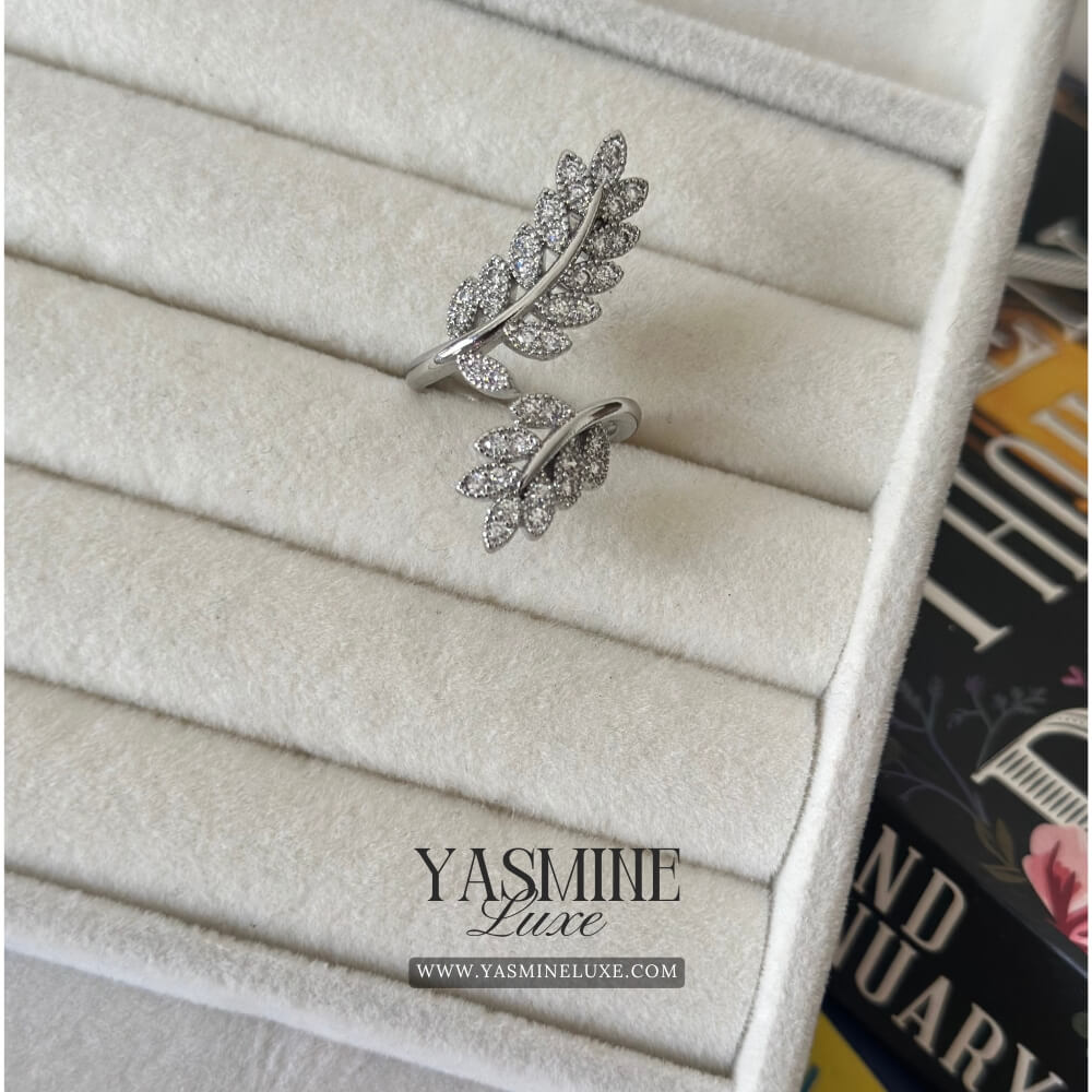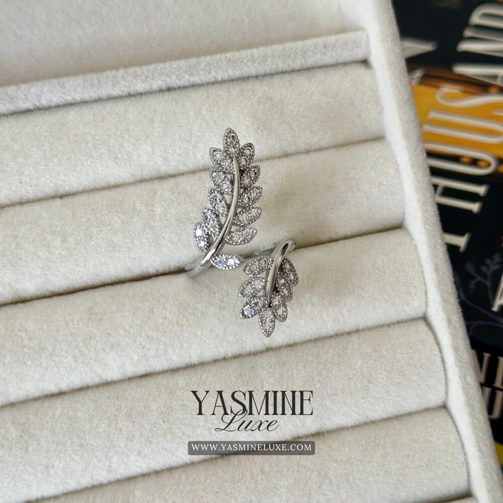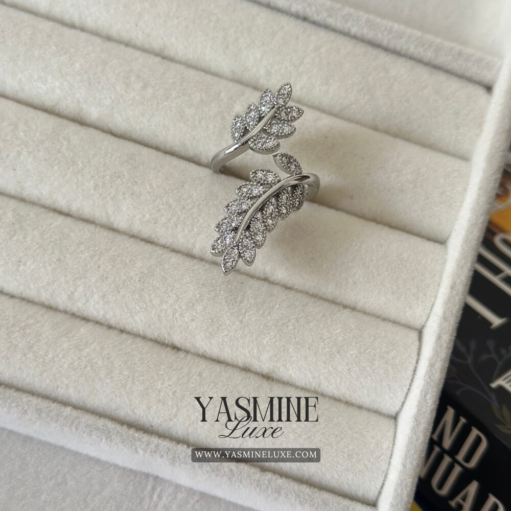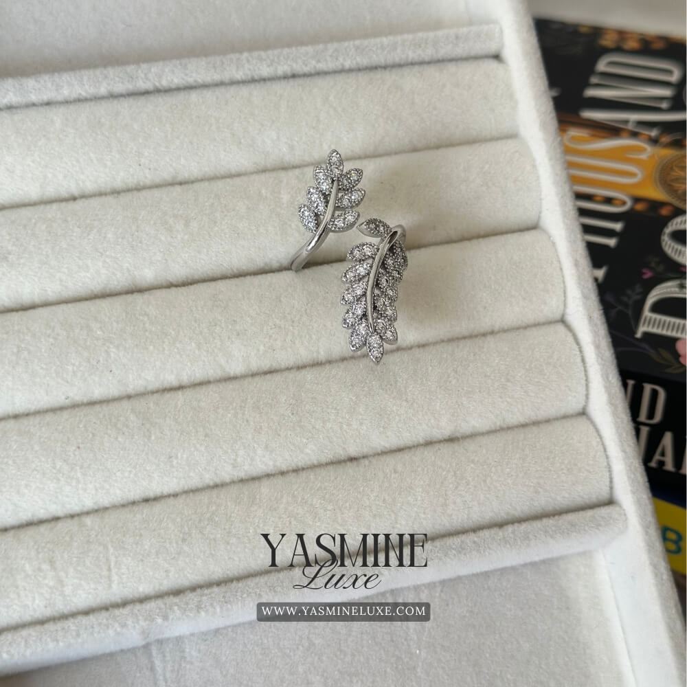 An adjustable, open-band ring where the two ends are designed as graceful, stylized leaf or fern motifs. Both leaf elements are completely covered in pave-set clear zircons, creating a dazzling, sparkling surface.