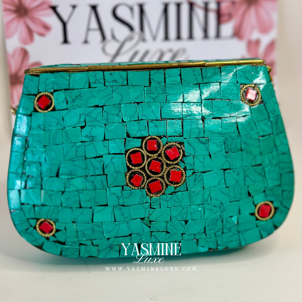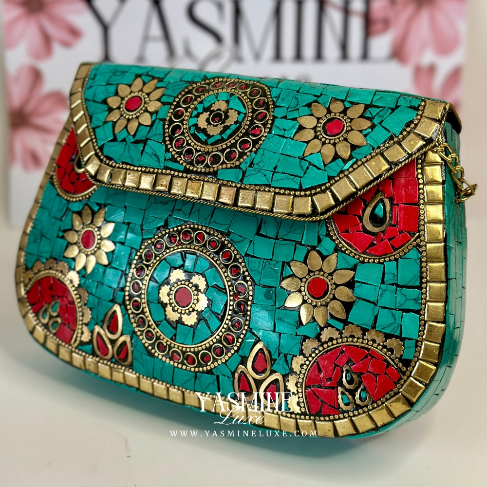 Ornate Turquoise & Coral Mosaic Box Clutch with Floral Embellishments