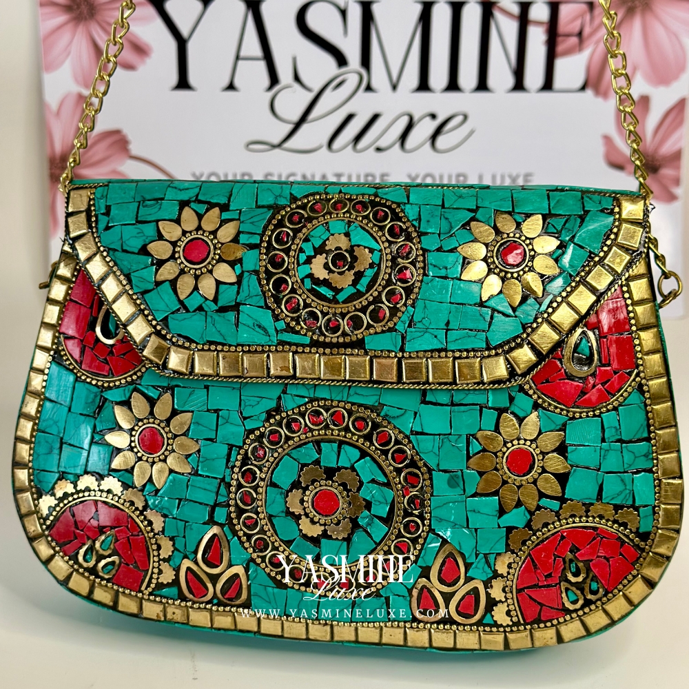 This vibrant hard-cased clutch features a lively mosaic of turquoise and coral-toned pieces, creating a bold, eye-catching design. Intricate gold-toned metalwork, adorned with floral and circular patterns, frames the beautiful mosaic, making this a stunning statement accessory for any special occasion.